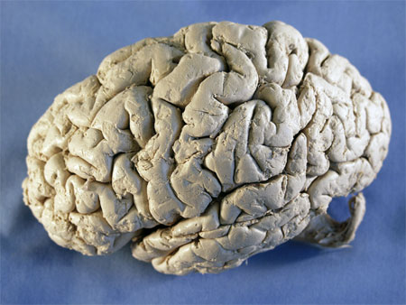 Once you have found these two major sulci, you should have no problem identifying other landmarks on the lateral surface of the cortex. You may have a little trouble finding the insular cortex and the primary auditory cortex. It's probably easier to find these regions in specimens that are not well fixed. To find the insular cortex, gently pull open the lateral fissure and look deep into the fissure. The "inusla" (island) is actually a quite recognizable feature on MRIs of the brain. The primary auditory cortex actually lies ont the surface of the superior temporal gyrus within the lateral fissure. A prominent feature is the transverse gyrus of Heschl, although you may not be able to see it without sectioning the brain. To find it, gently insert your finger into the lateral fissure and run it along the surface of the superior temporal gyrus. Within the posterior aspects of the fissure, you should find a "ridge" on top of the suprior temporal gyrus that extends back into the fissure from the lateral surface. This is the transverse gyrus which marks the auditory cortex. Mover your cursor over the picture to identify some of the landmarks you will find. Note that everything discussed in the lab manual is not necessarily labeled. Two areas are highlighted in the image, one in the inferior frontal gyrus which includes the operculum (just anterior to the post-central gyrus) and part of the pars triangularis of the inferior frontal gyrus; and a second in the posterior aspects of the superior temporal gyrus, just below where you would be expected to find the primary auditory cortex. These two functional areas will usually be found in the left hemisphere of 90 - 95% of all individuals. What are these areas called and what is their functional significance? |